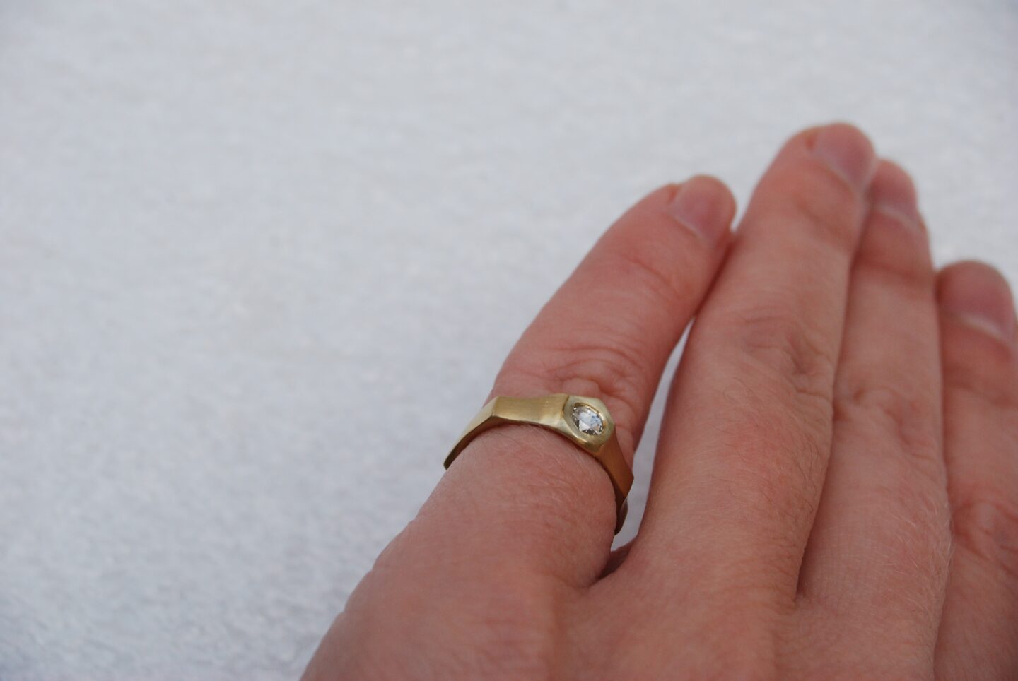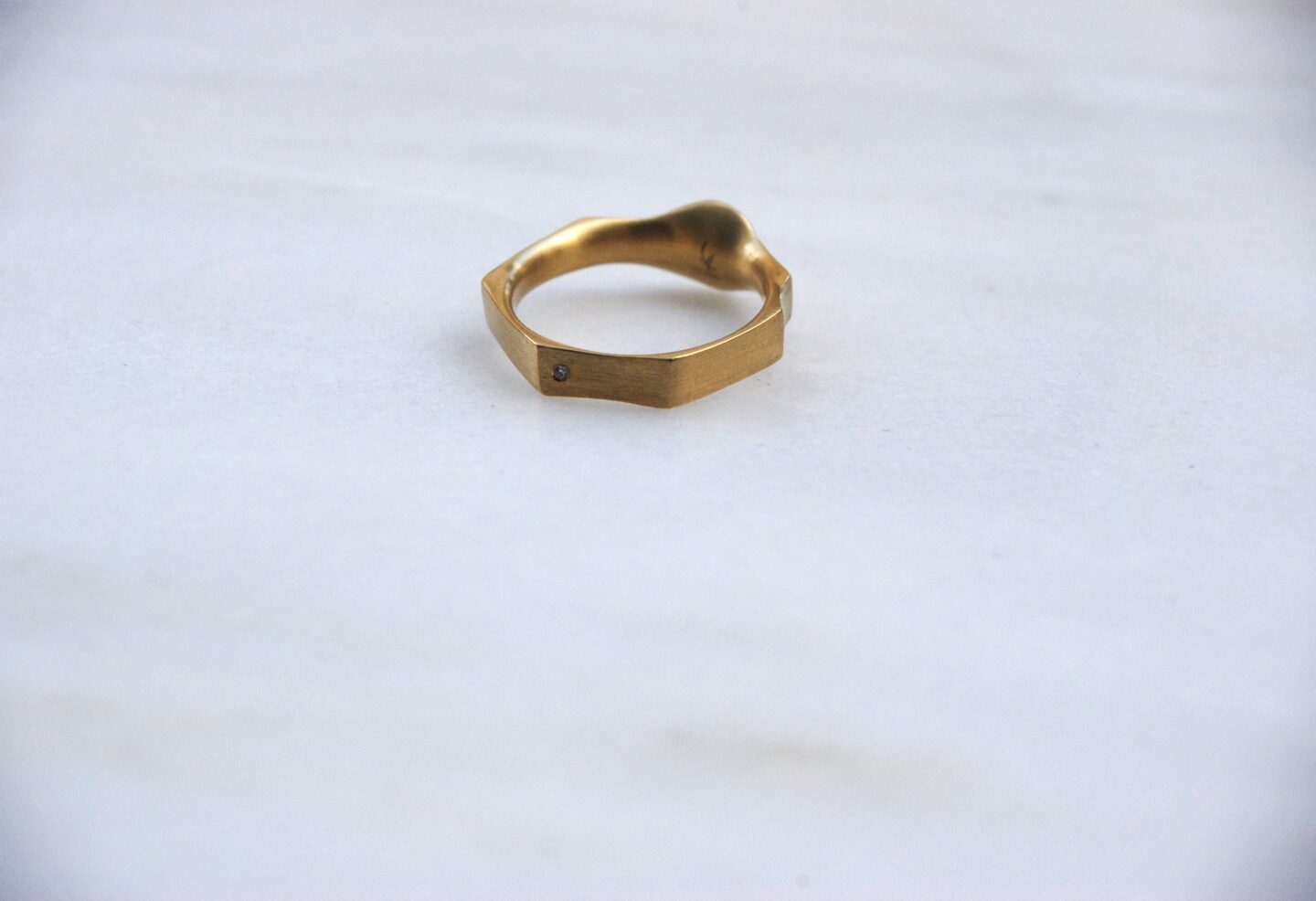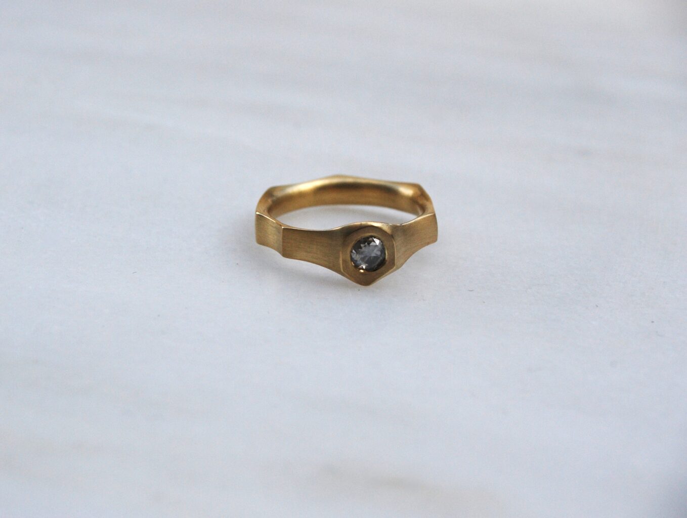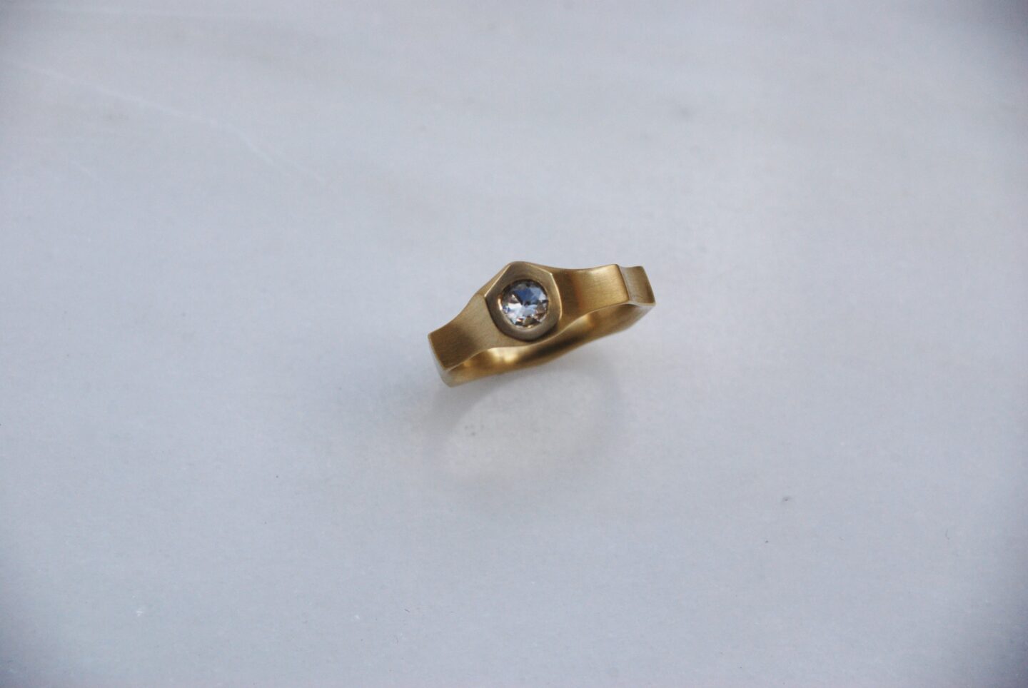 Magma series ring crafted in 18ct yellow gold, featuring a rose-cut diamond complemented by a small brilliant-cut diamond set on the lower part. Designed as a unique and timeless engagement ring.
